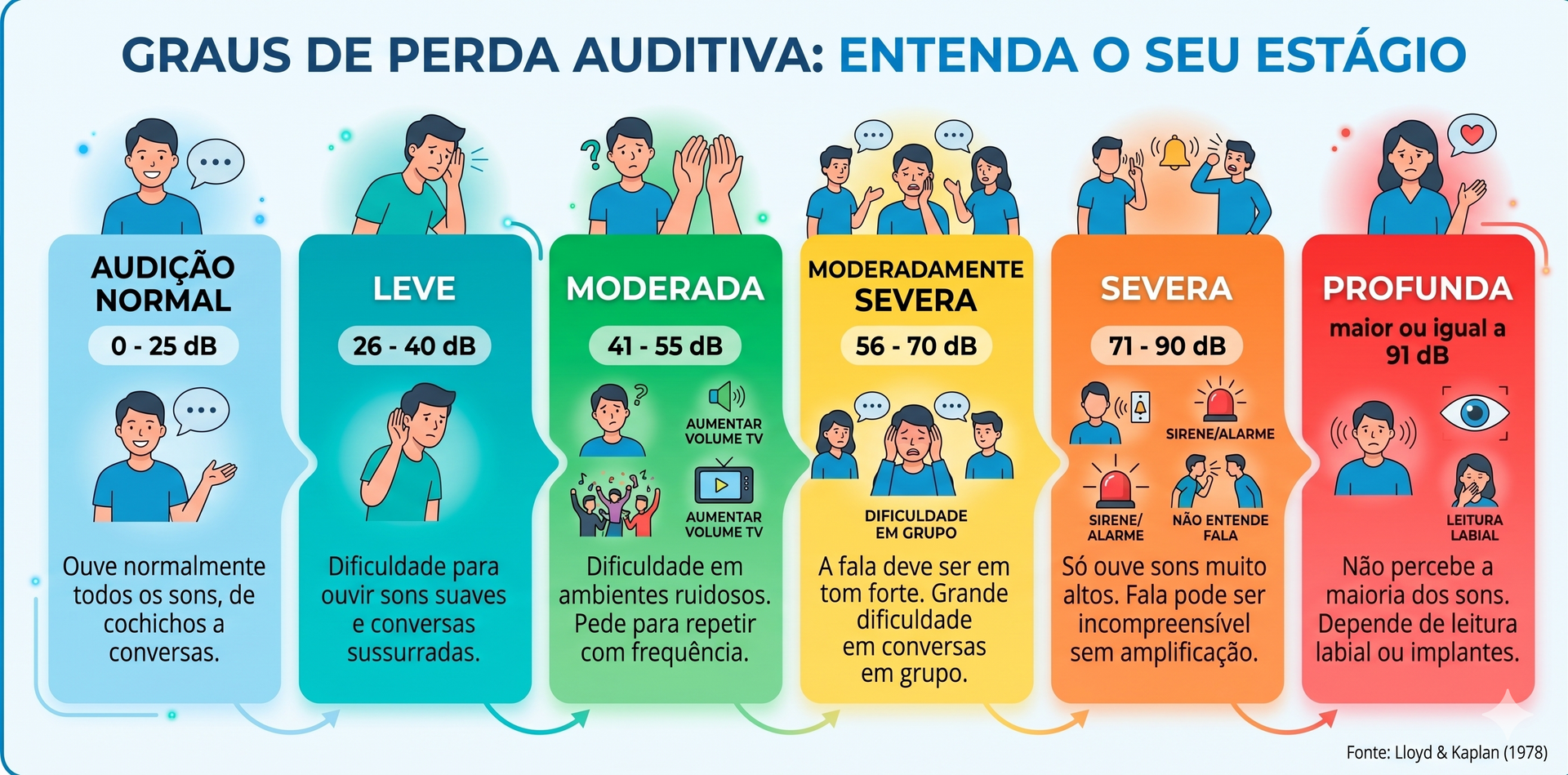 A perda auditiva é gradual e, muitas vezes, silenciosa. Ela é medida em decibéis (dB) e classificada de acordo com o impacto que causa na sua comunicação diária. Confira os graus e veja se você identifica esses sinais no seu dia a dia: