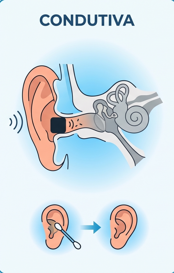- Causas: Acúmulo de cera, infecções de ouvido (otites), água no ouvido ou perfuração timpânica.