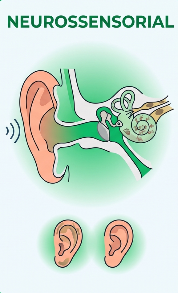 O desgaste das células ou nervos. É o tipo mais comum e ocorre quando há danos às células sensoriais da cóclea ou ao nervo auditivo. O som chega, mas o cérebro tem dificuldade em interpretar as palavras.